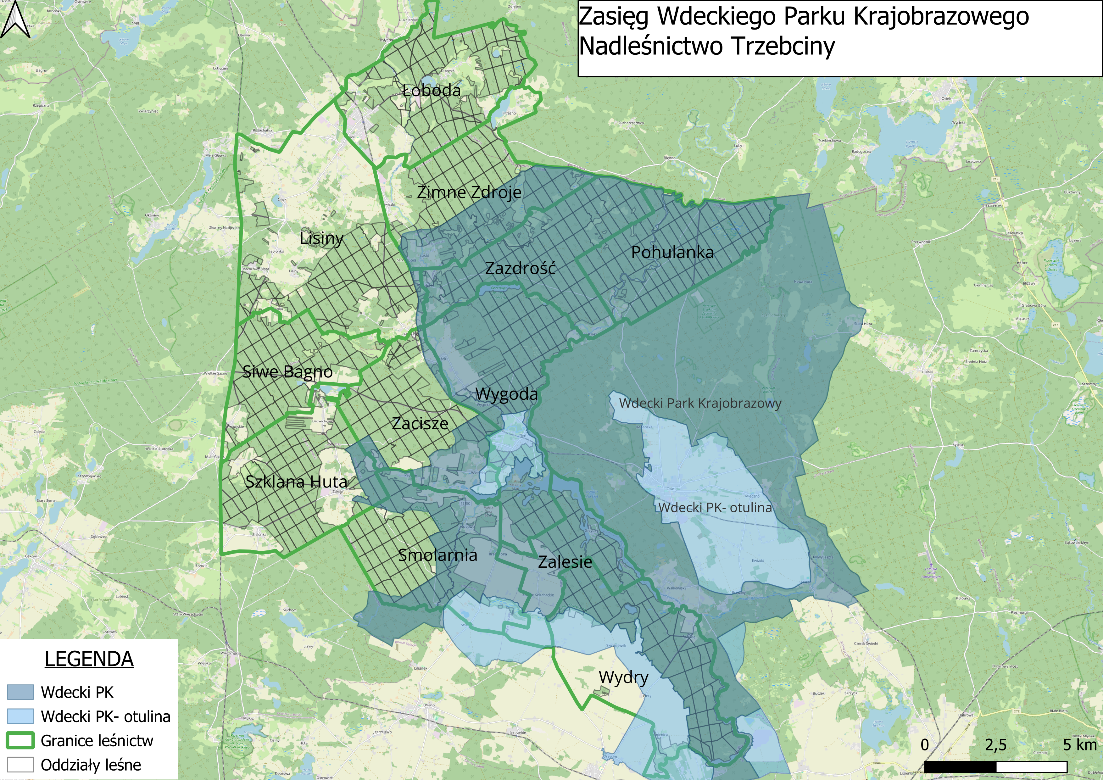 Wdecki Park Krajobrazowy obejmuje w całości leśnictwa Pohulanka, Zazdrość, Wydry, Zalesie, Wygoda a także części leśnictw Zimne Zdroje, Smolarnia, Zacisze oraz Szklana Huta.