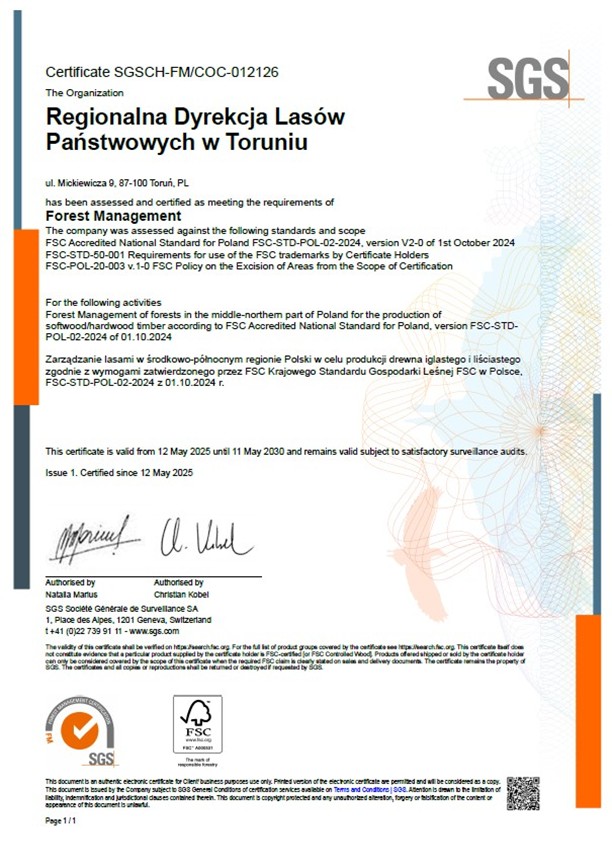 Zakres certyfikatu: zarządzanie lasami w środkowo-północnym regionie Polski w celu produkcji drewna iglastego i liściastego zgodnie z wymogami zatwierdzonego przez FSC Krajowego Standardu Gospodarki Leśnej FSC w Polsce, FSC-STD-POL-02-2024 z 01.10.2024 r.