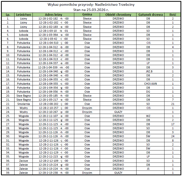 „Najświeższymi” pomnikami przyrody na terenie Nadleśnictwa Trzebciny są ustanowione Uchwałą Rady Gminy Osie z dnia 20.02.2026 r. okazy: Dębu szypułkowego, Choiny kanadyjskiej, Daglezji zielonej, Cisa pospolitego oraz Lipy drobnolistnej w leśnictwie Pohulanka.